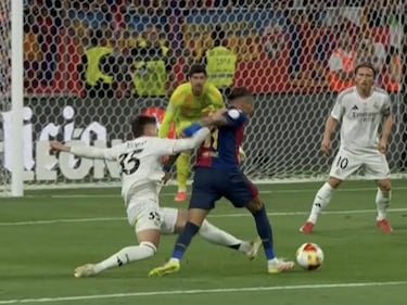 Sí se equivocó en los primeros minutos: Lucas Vázquez debió ser amonestado por una fea entrada sobre Raphinha. Cuando el azulgrana se preparaba para controlar un balón, el madridista le pisó la zona del sóleo. Fue sin opción de disputar el balón y muy alto. Debió ser cartulina. Pero no se la mostraron.