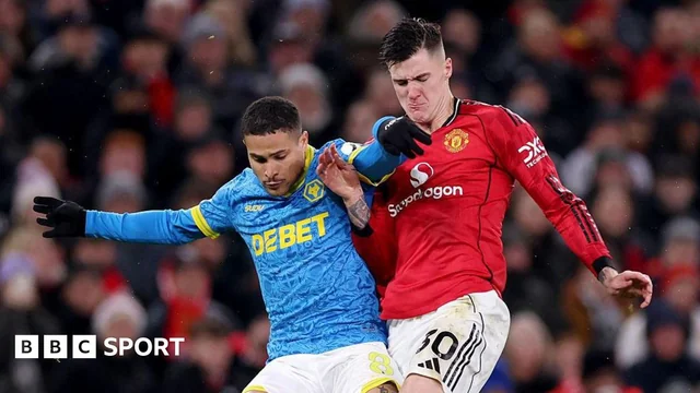 United con varias de sus estrellas en la grada.  Wolves empezó a acumular posesión y a merodear el área de Lammens. Que pudiesen rascar algo en su visita a Old Trafford dejaba de parecer algo descabellado. Hasta que en una de esas llegó el primer gol del partido. Heaven, uno de los pocos que parecía tener sangre, robó en campo contrario y salió directo hacia la frontal. Con algo de suerte. Aunque no tanta como la que tuvo Zirkzee. El holandés se hizo con el balón cuando lo perdió su compañero, y su disparo dio en un defensor para dejar vendido a Sá. El meta se tiró hacia un lado, y el balón se fue hacia el otro.