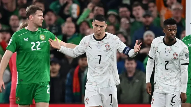 Fue un partido durísimo para los de Roberto Martínez. En la previa Cristiano Ronaldo comentó que esperaba un clima bastante hostil, como que se dio así, sobre todo cuando se fue expulsado. Las tribunas del estadio Irlandés, lo despidieron con insultos y pifias al ídolo portugués que ya pronosticaba un partido con el cuchillo entre los dientes “un equipo que juegue con bloque bajo. Será como en la ida. Los saques de bandas parecerán córneres”. Mientras pronunciaba esas palabras estaría recordando lo que pasó hace un mes en Lisboa, cuando Portugal tuvo un 70% de posesión y remató 30 veces a puerta por dos de los visitantes para un 1-0 logrado sobre la bocina (92’). Aquel día, CR7 falló un penal. El seleccionador irlandés Heimir Hallgrímsson no le decepcionó y salió con cinco defensas y su bloque bajo. Listos para ser sometidos por João Neves y Vitinha. Roberto Martínez eligió la imaginación de João Félix, en estado de gracia, antes que la velocidad de Leão mientras echaba en falta a Bruno Fernandes por sanción.